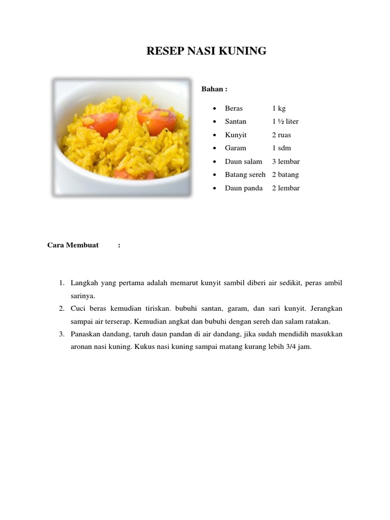 Semoga sehat selalu dan bahagia. Resep Nasi Kuning Nasi kuning adalah salah satu nasi gurih layaknya Nasi Lemak dan Nasi Liwet Sunda yang terbuat dari beras yang dimasak dengan bumbu rempah seperti kunyit bawang serai dan santan. Campur masukkan ke rice cooker masak sampai matang.